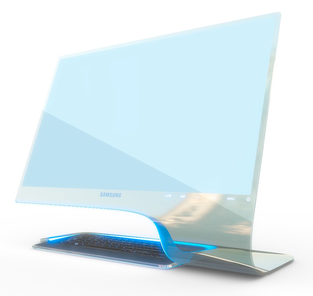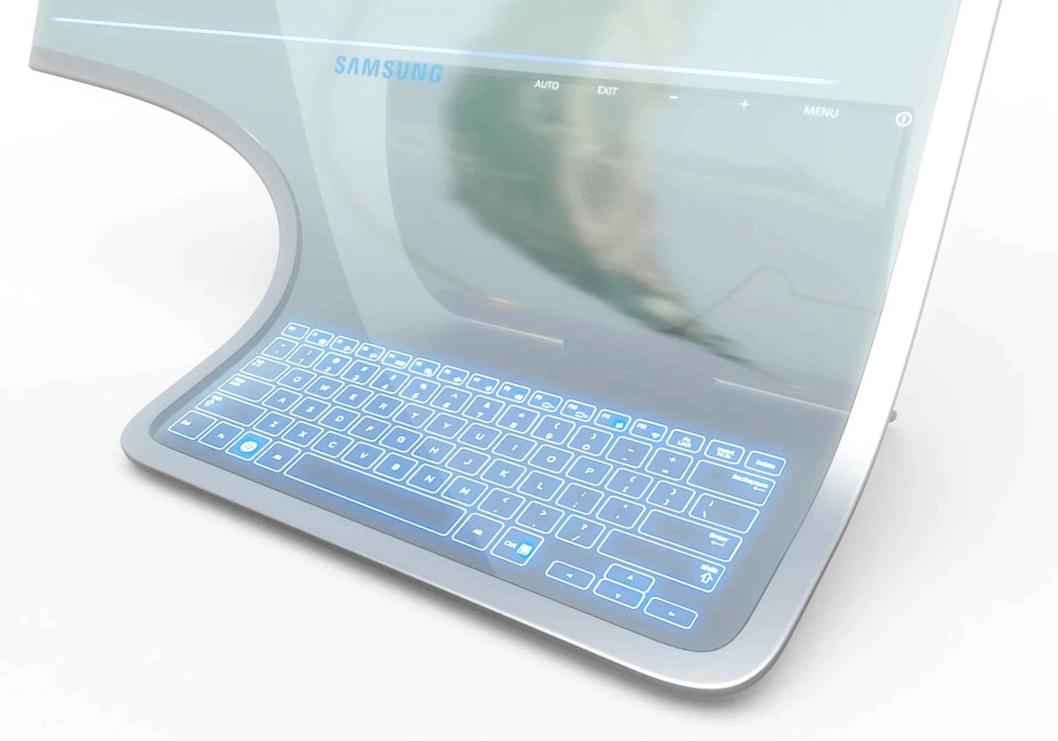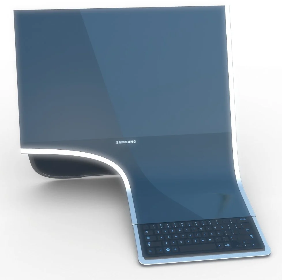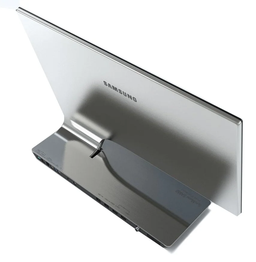 ORIGAMI Metal Monitor Origami-inspired folded metal with black anodized front with touch sensitive controls and clear anodized aluminum rear. Cantilevered base to support display weight and temporary keyboard storage with inductive charging.