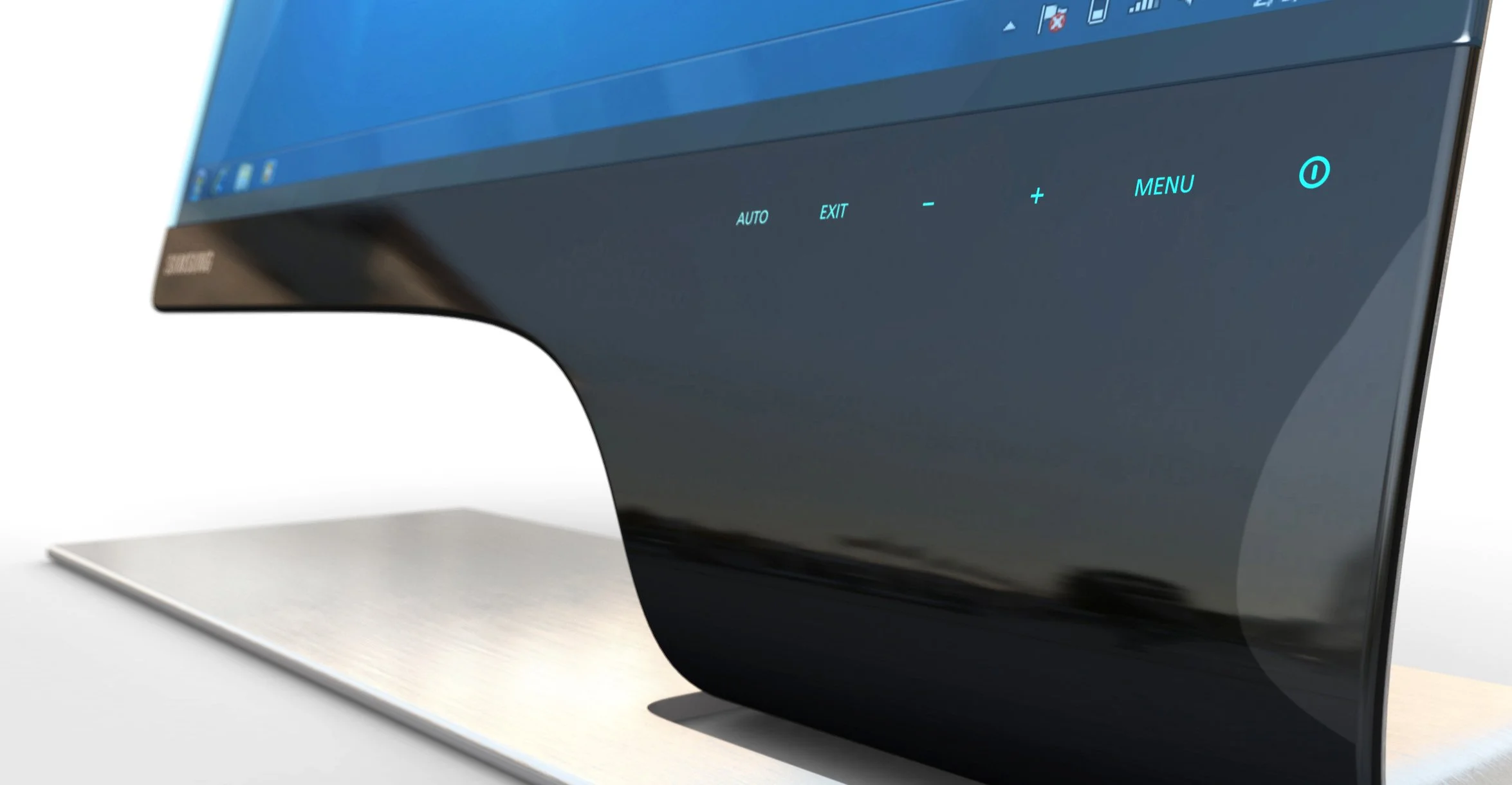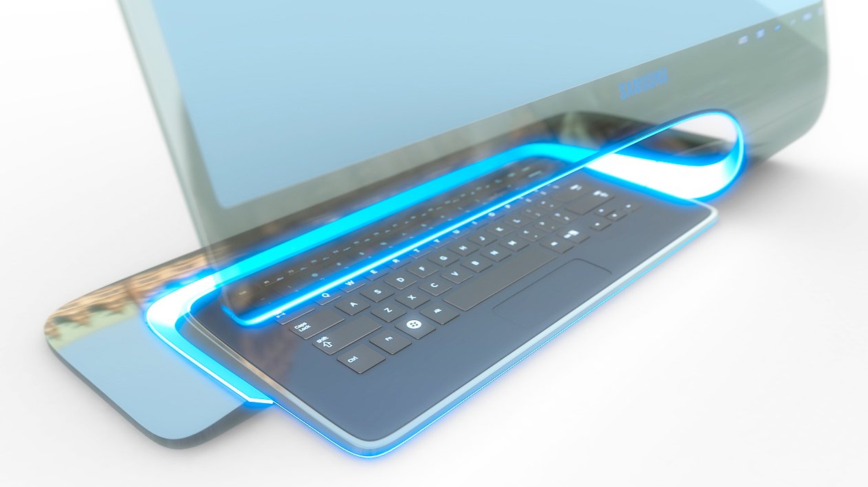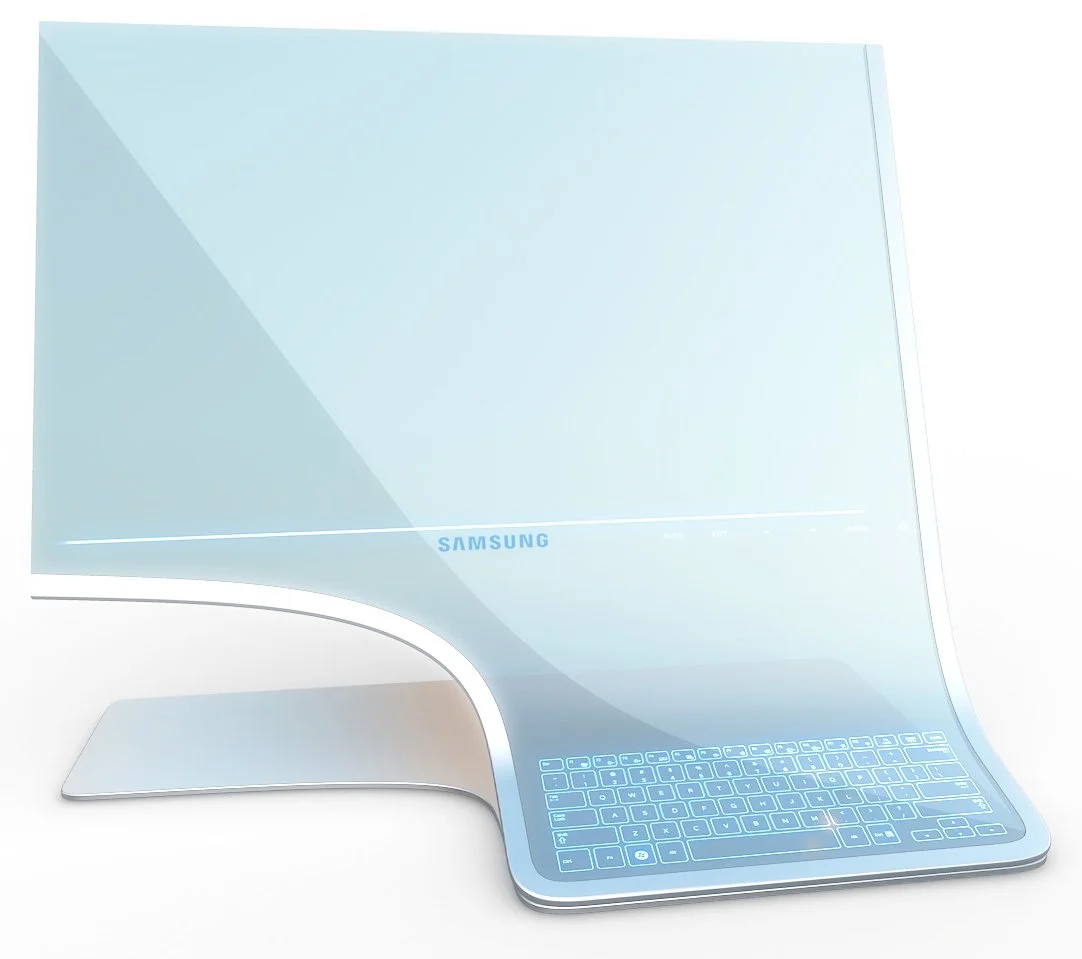 ORIGAMI Metal Monitor Origami-inspired folded metal with black anodized front with touch sensitive controls and clear anodized aluminum rear. Cantilevered base to support display weight and temporary keyboard storage with inductive charging.